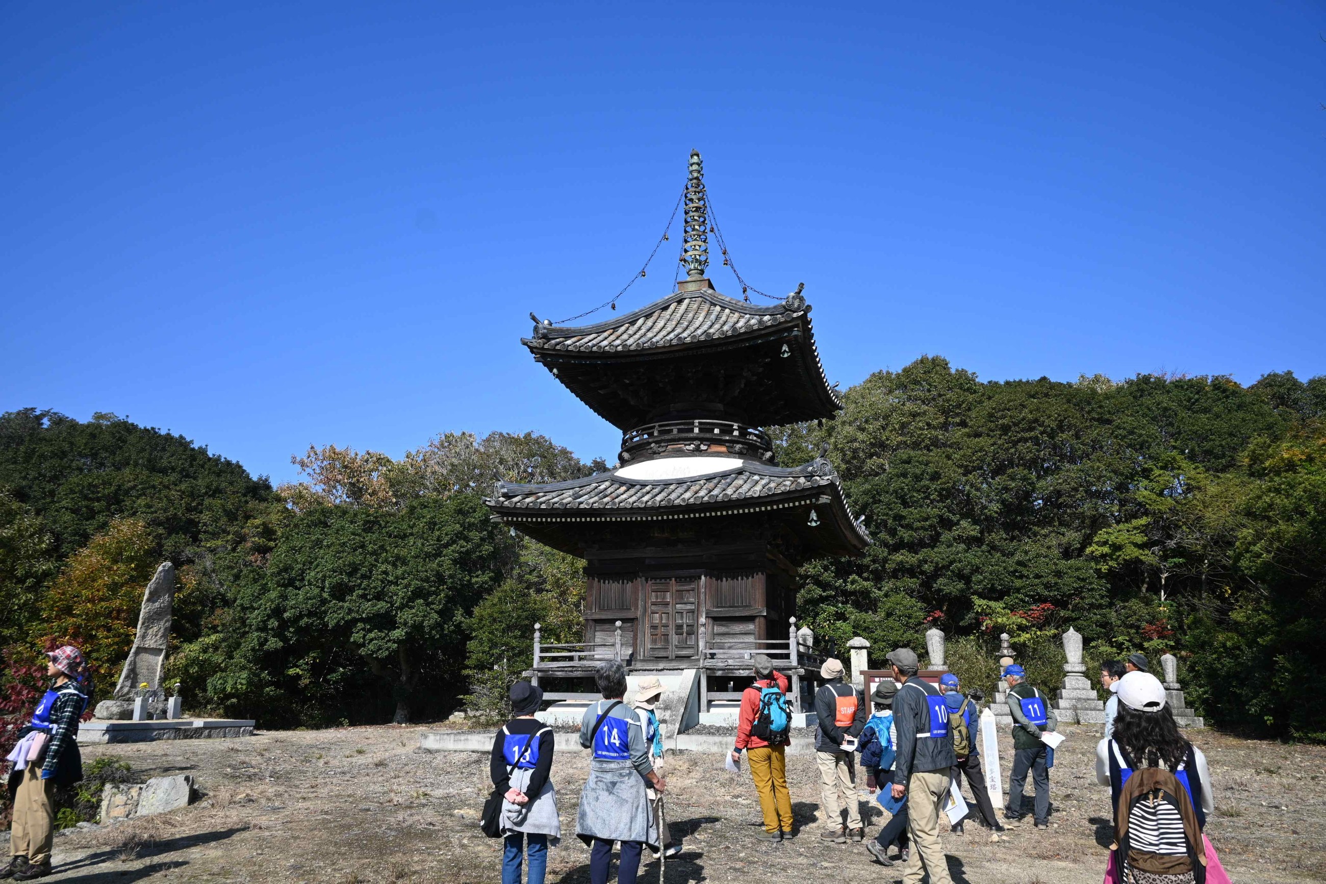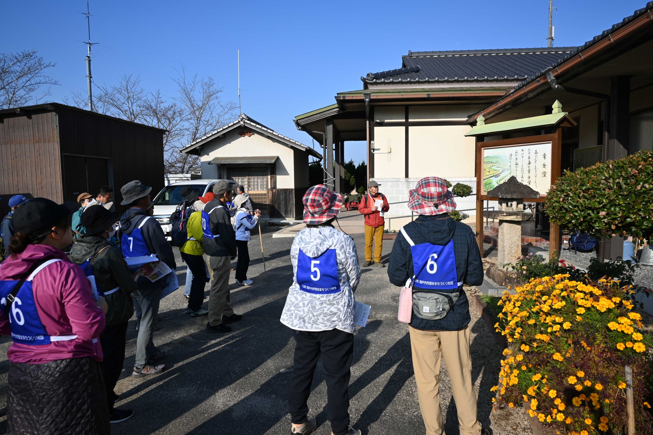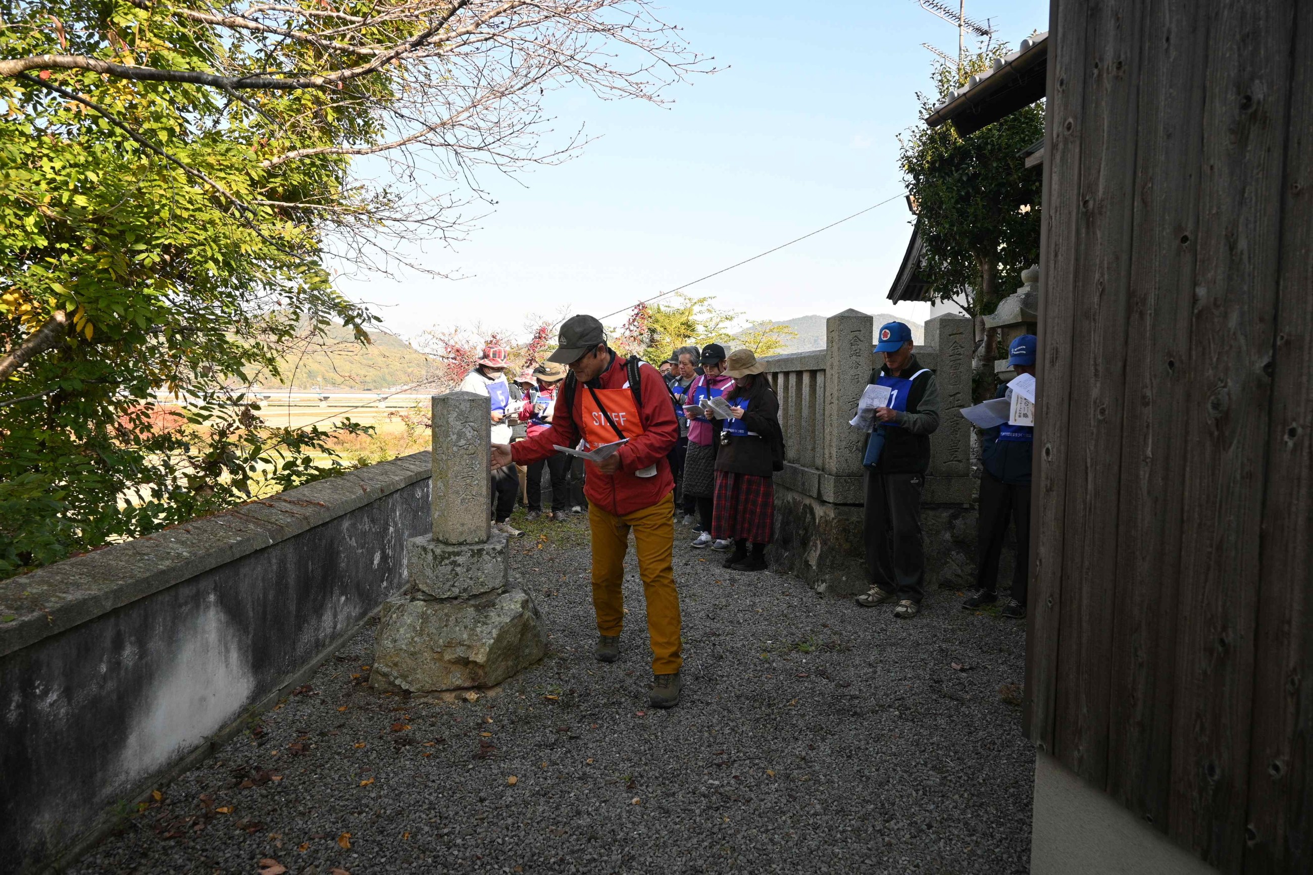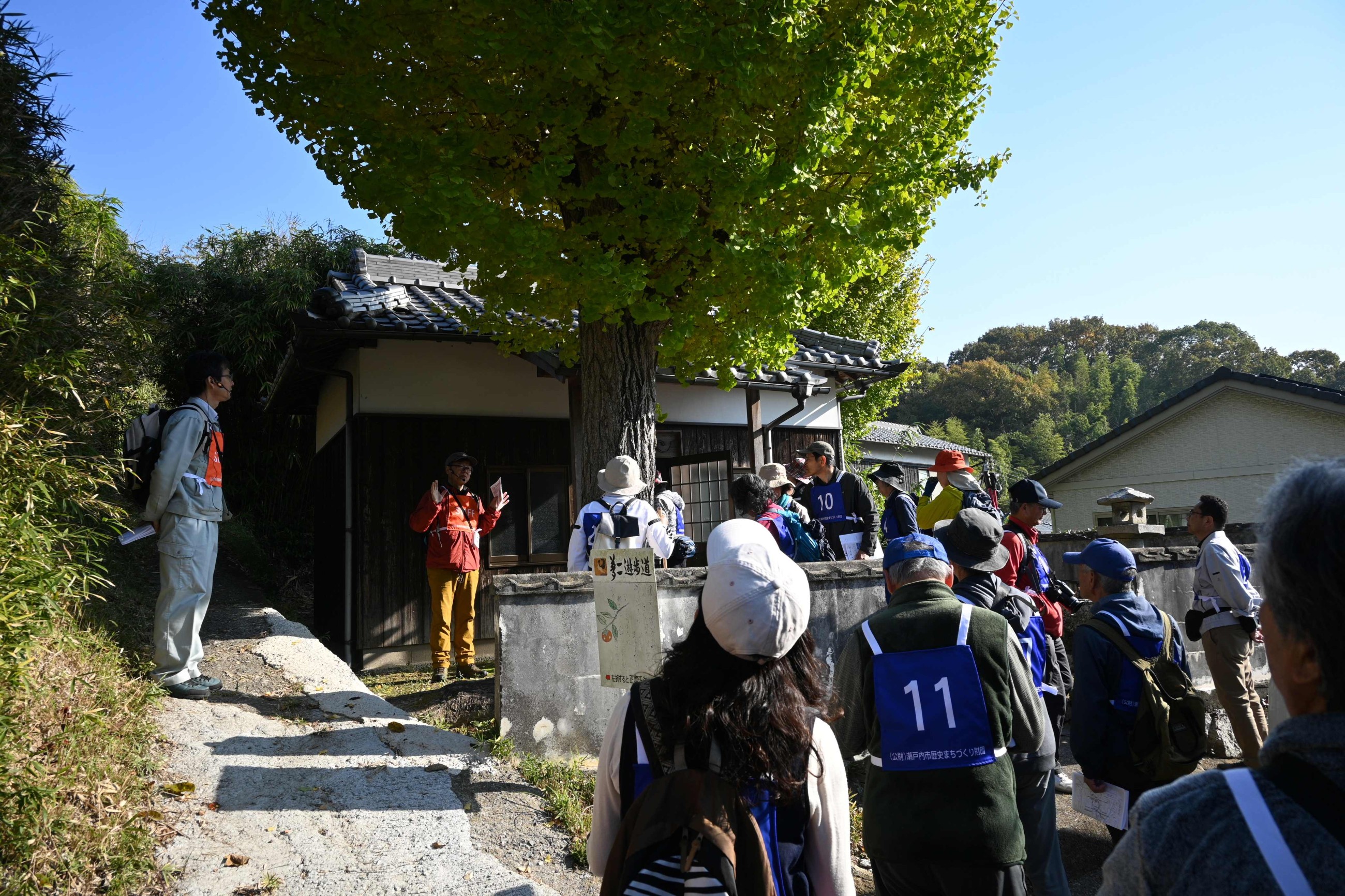 気持ちのいい秋晴れのもと、案内人の安木 義忠氏と村上 岳氏(ともに公益財団法人瀬戸内市歴史まちづくり財団)によるこの地域の歴史、文化、自然についての解説や、人物にまつわる興味深いエピソードを聞きながら、27名(関係者含む)が約5kmの道のりを歩きました。