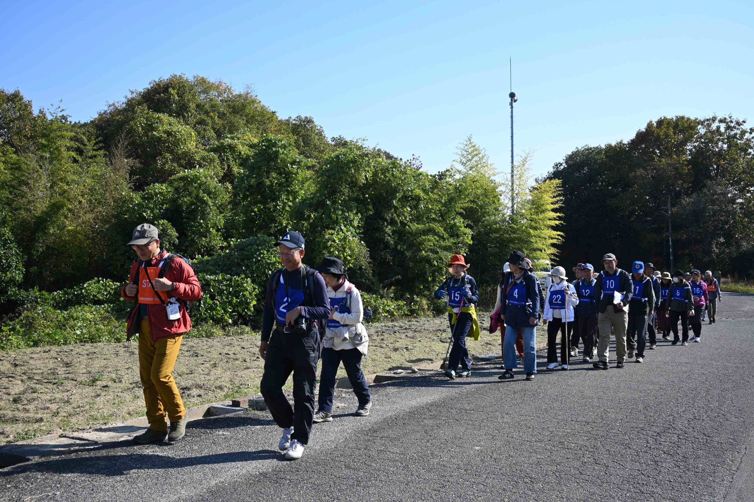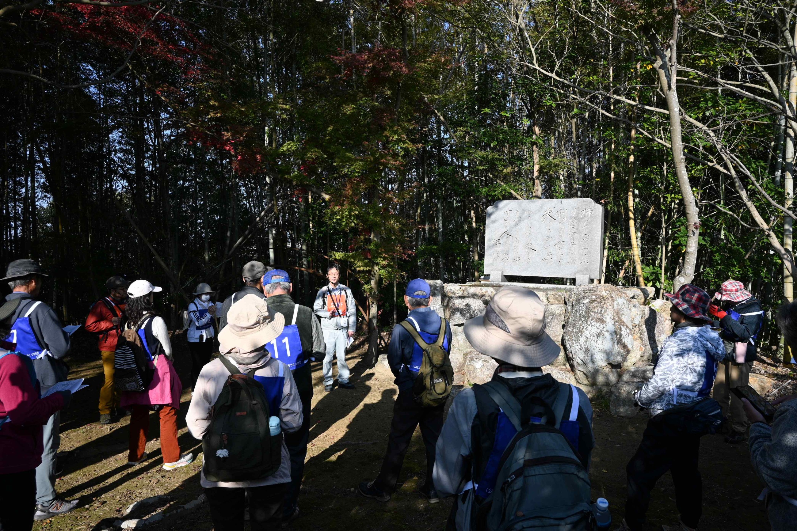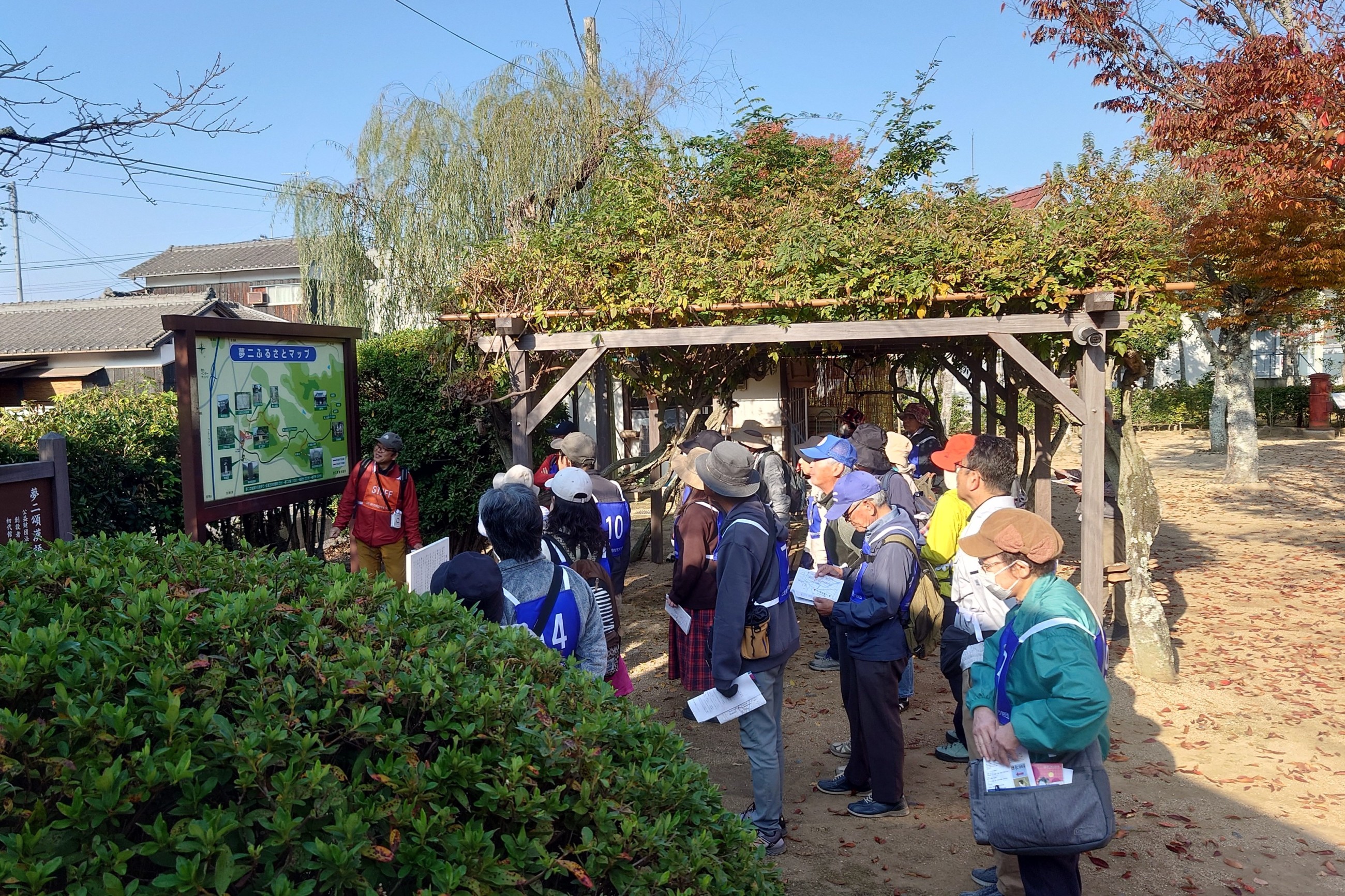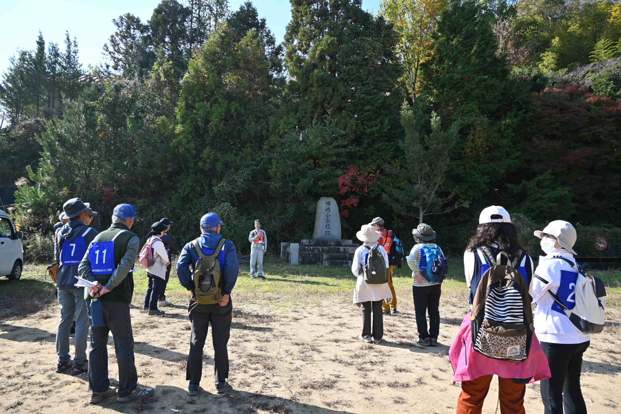 気持ちのいい秋晴れのもと、案内人の安木 義忠氏と村上 岳氏(ともに公益財団法人瀬戸内市歴史まちづくり財団)によるこの地域の歴史、文化、自然についての解説や、人物にまつわる興味深いエピソードを聞きながら、27名(関係者含む)が約5kmの道のりを歩きました。