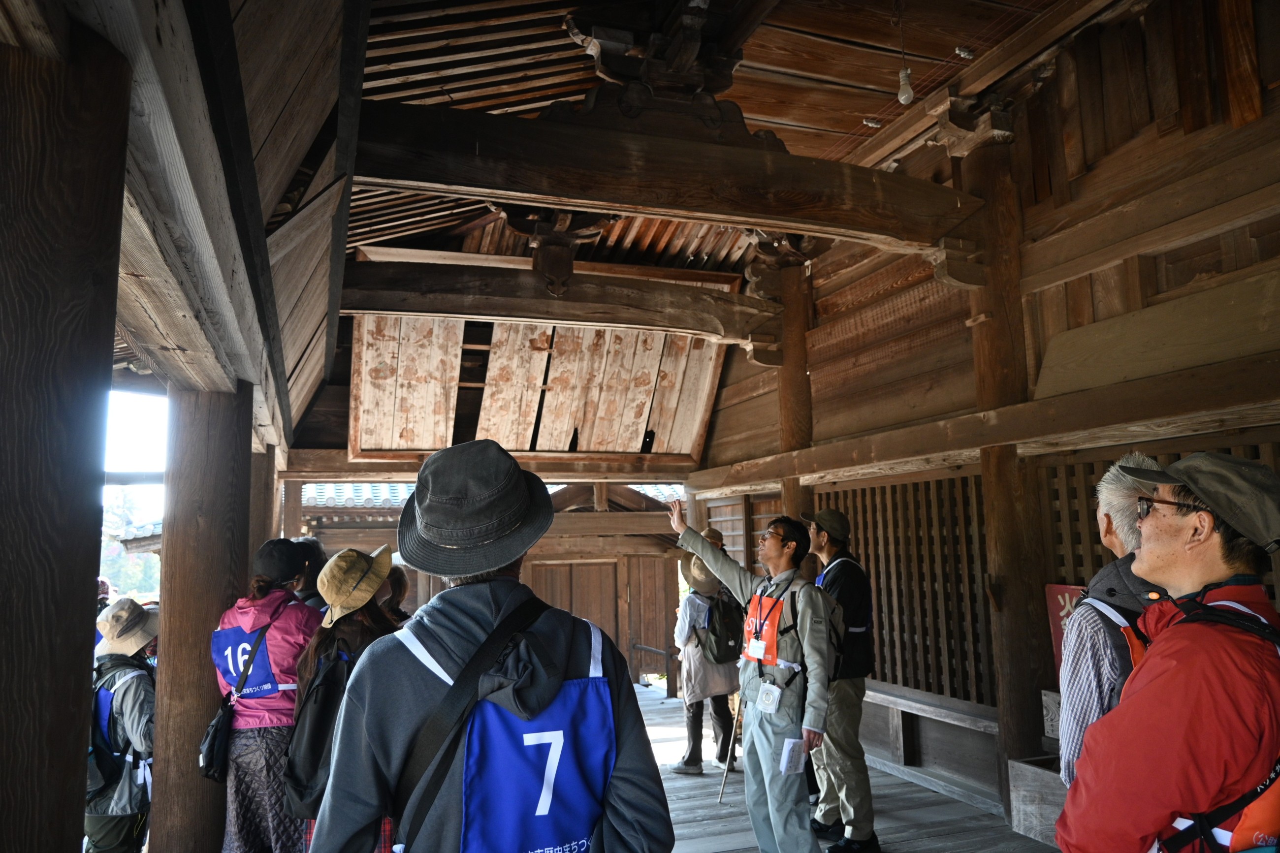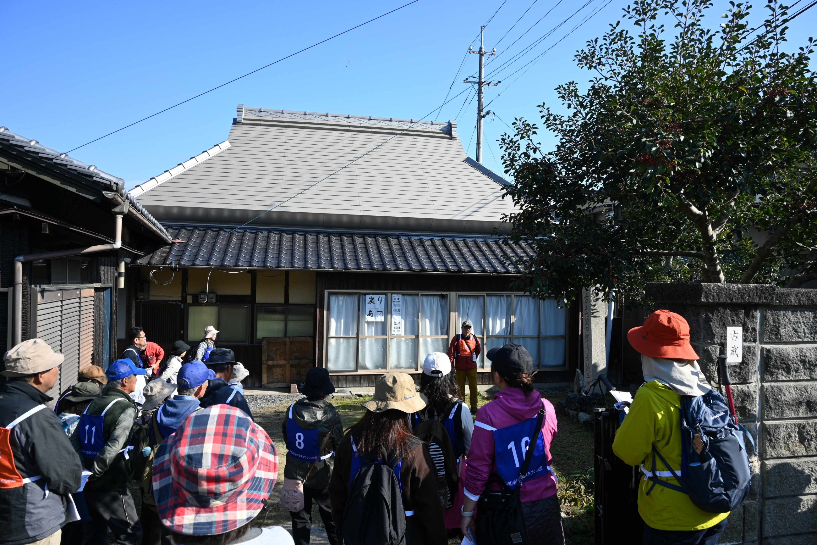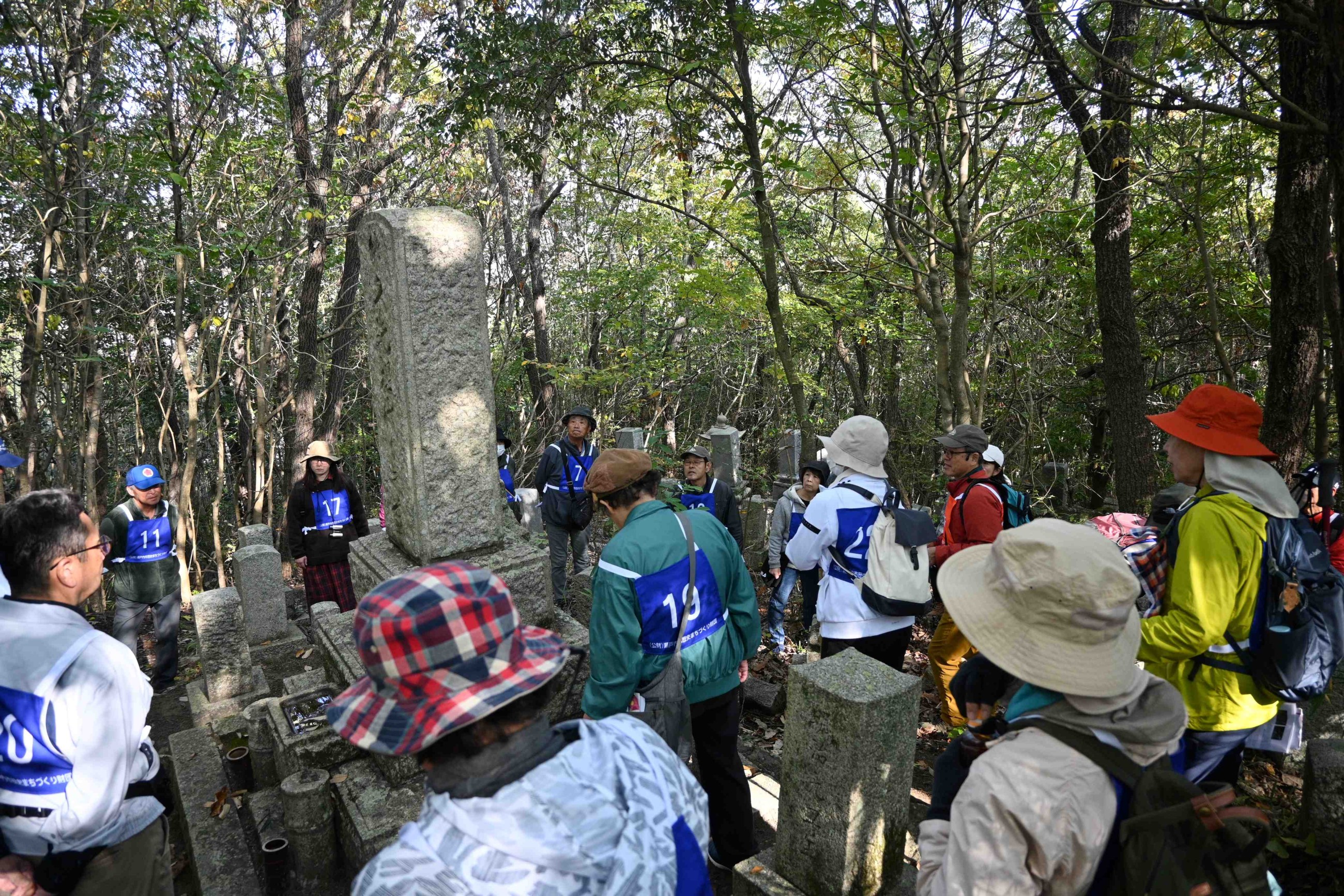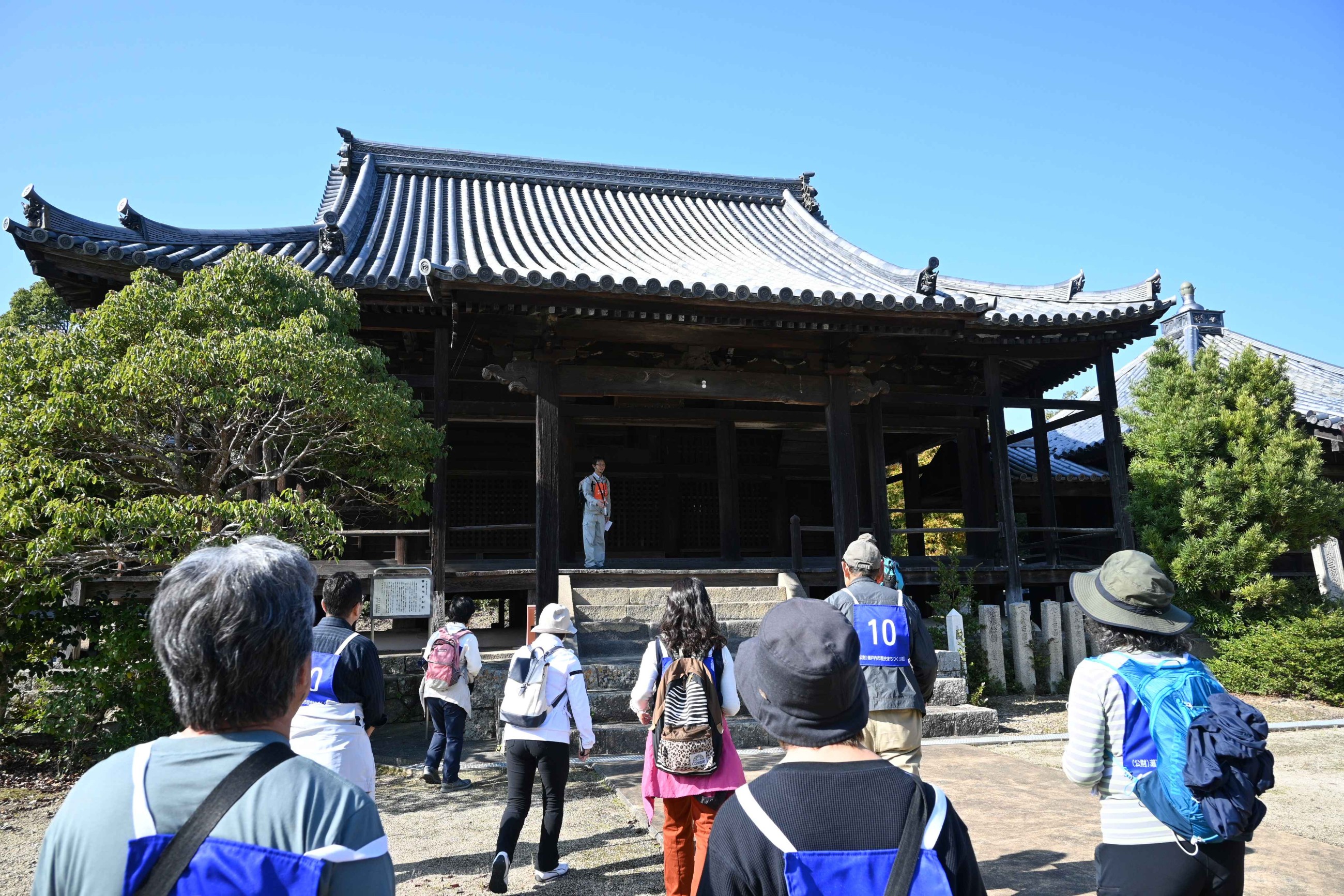 気持ちのいい秋晴れのもと、案内人の安木 義忠氏と村上 岳氏(ともに公益財団法人瀬戸内市歴史まちづくり財団)によるこの地域の歴史、文化、自然についての解説や、人物にまつわる興味深いエピソードを聞きながら、27名(関係者含む)が約5kmの道のりを歩きました。