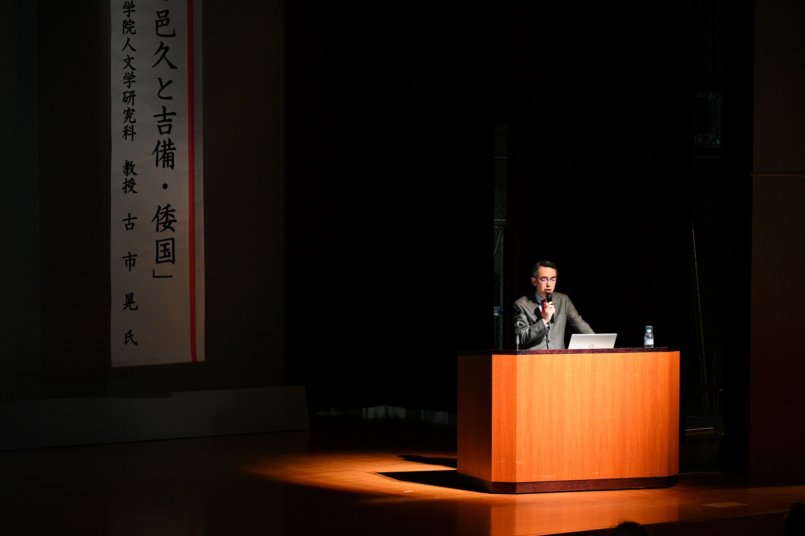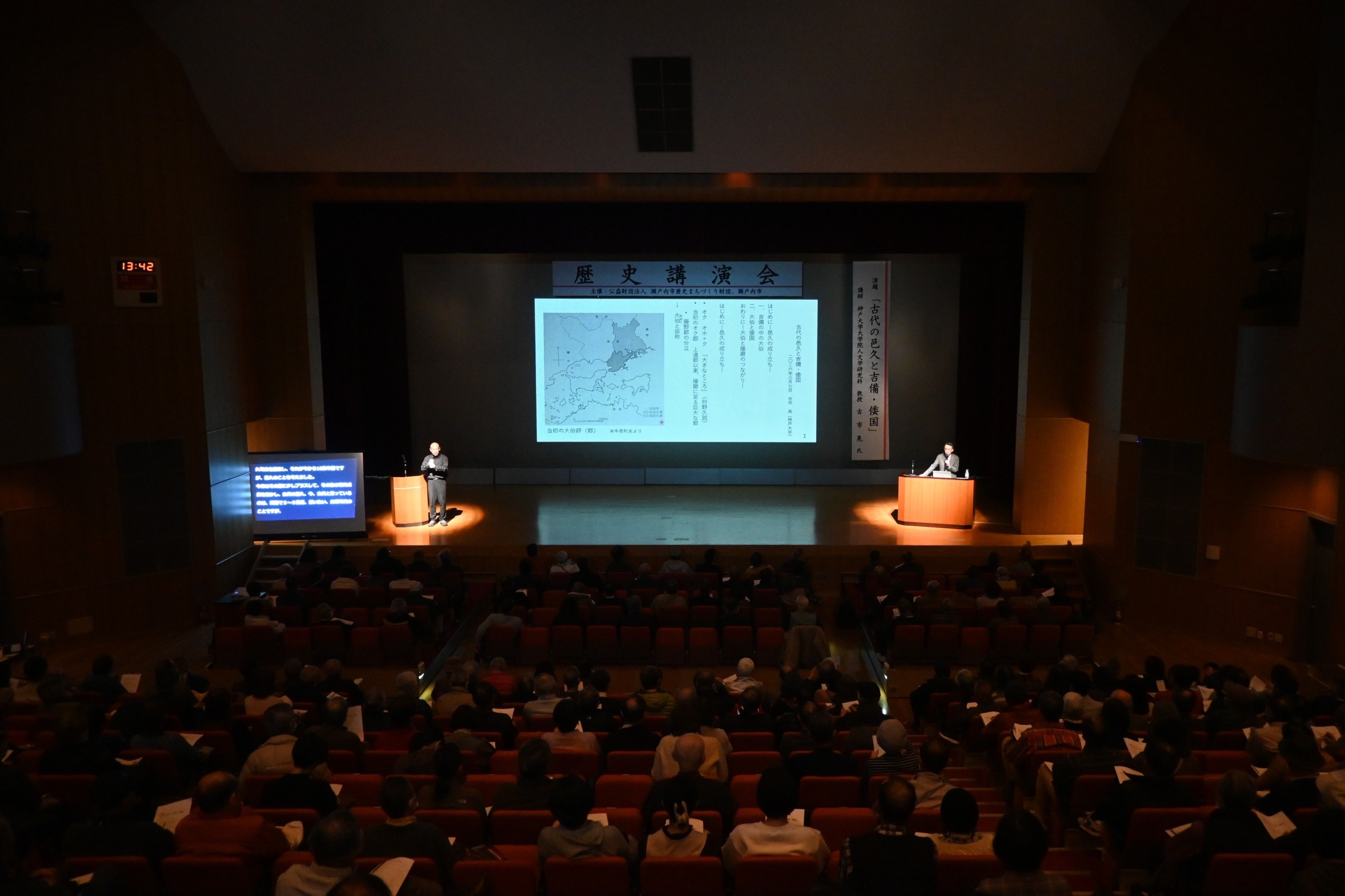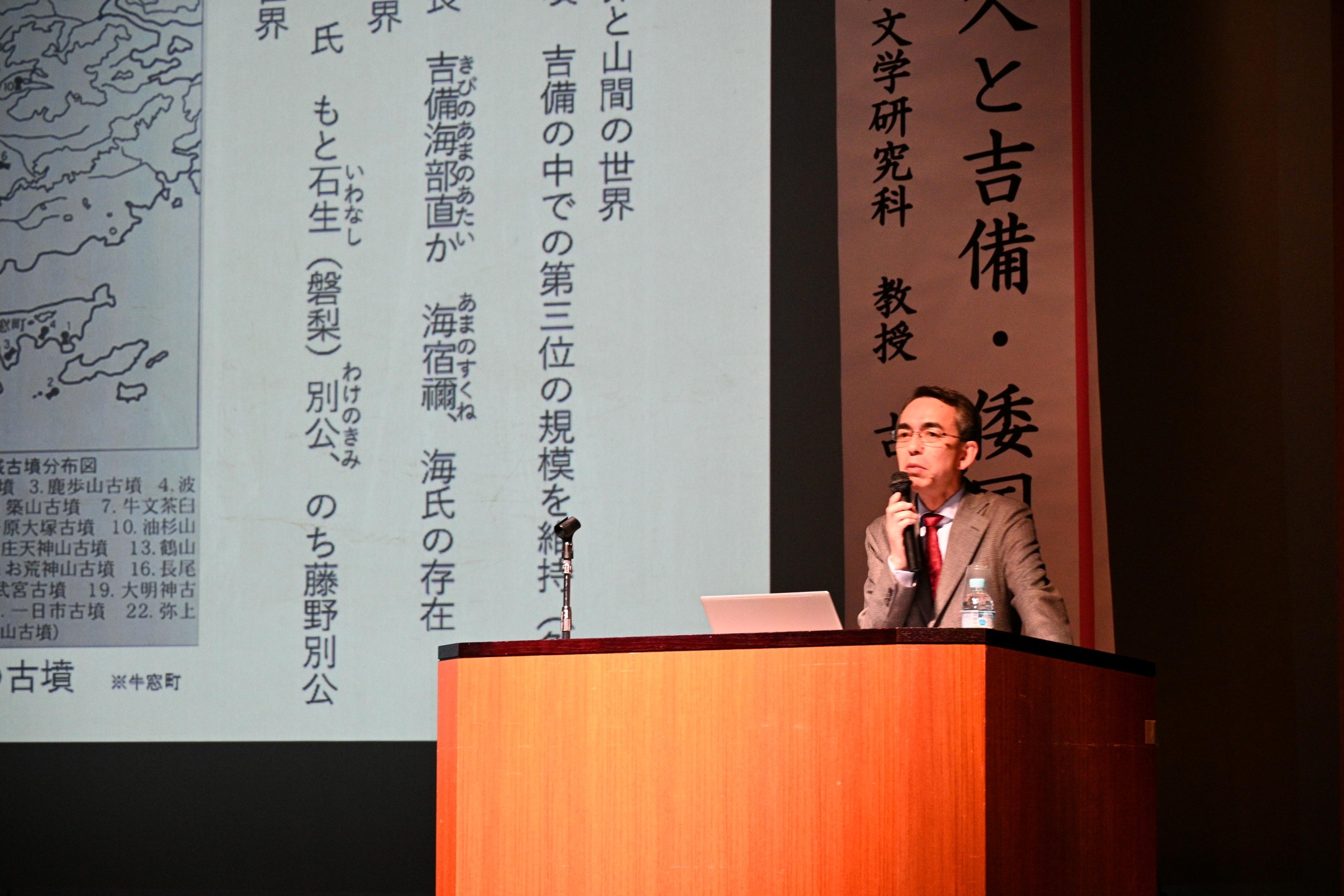 「古代の邑久と吉備・倭国」と題して、『古事記』や『日本書紀』といった古代の歴史書、また木簡など発掘調査で出土する文字資料を中心にみながら、古代の邑久郡が吉備と呼ばれた勢力の中で果たした役割、また当時「倭国」と呼ばれた日本の中での役割について考えるこの講演を、市民ら300人が聴講しました。